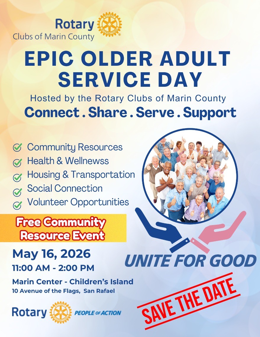 The Marin Rotary Epic Older Adults Service Day, a FREE event on May 16th is designed to recognize, honor and serve the older adults in our county. We plan to bring together Rotarians, Rotary Clubs, community members, and local nonprofit and government organizations to bring awareness, communicate and connect our older adults to the resources available to support their well-being and independence, and make the most impact on our older adults’ lives.